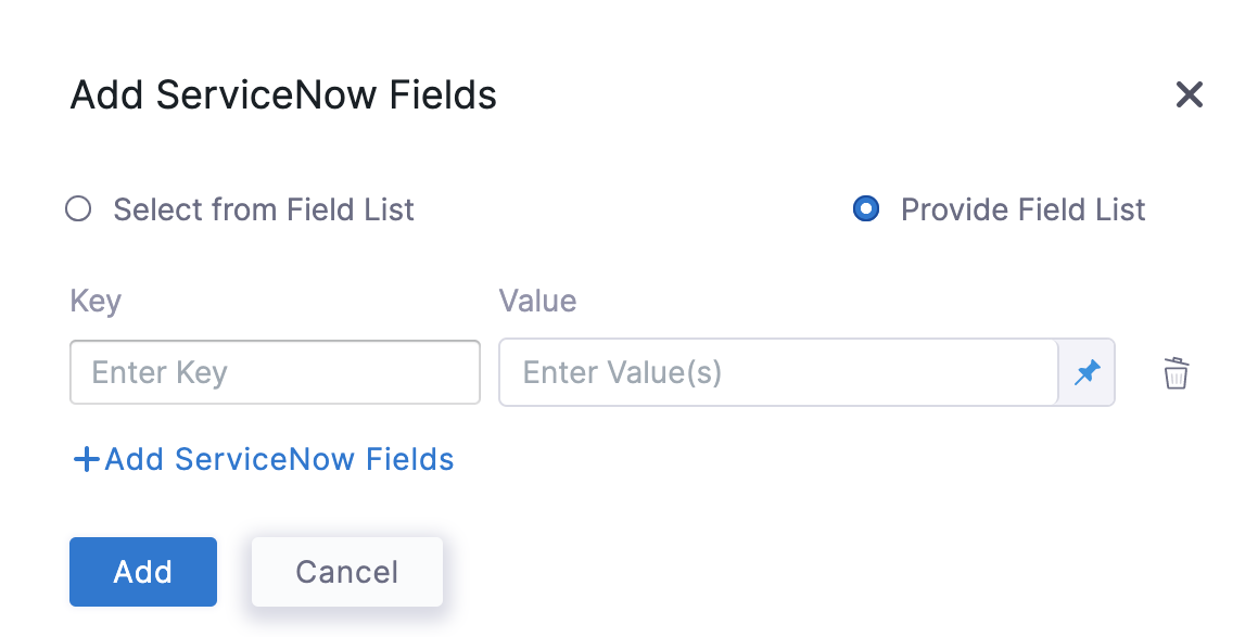 Click Fields. The Add ServiceNow Fields settings appear.