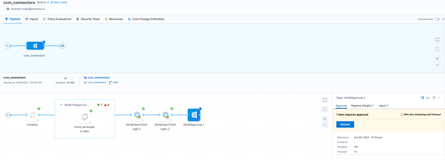 - Review and approve the pipeline. In this example, I've been assigned Project Admin for all resources so I can approve the pipeline. If you want to add RBAC for who can approve your pipeline, either give them Project Admin or use the fine-grain